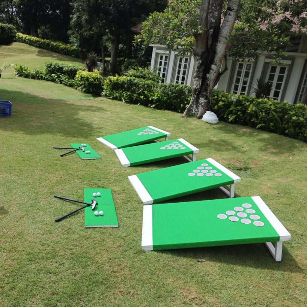 Fun 2-on-2 game combining golf putting and pong, using an 11 ft green.