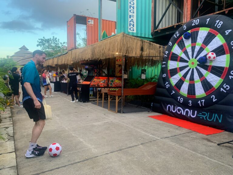 Bali Games Rentals provided five games, including foosball, speed ball, air hockey, popper, and giant soccer dart ball. Visitors were enthusiastic about trying these games, with added excitement from souvenir prizes for those who successfully kicked the ball into the circle on the giant soccer dart ball.