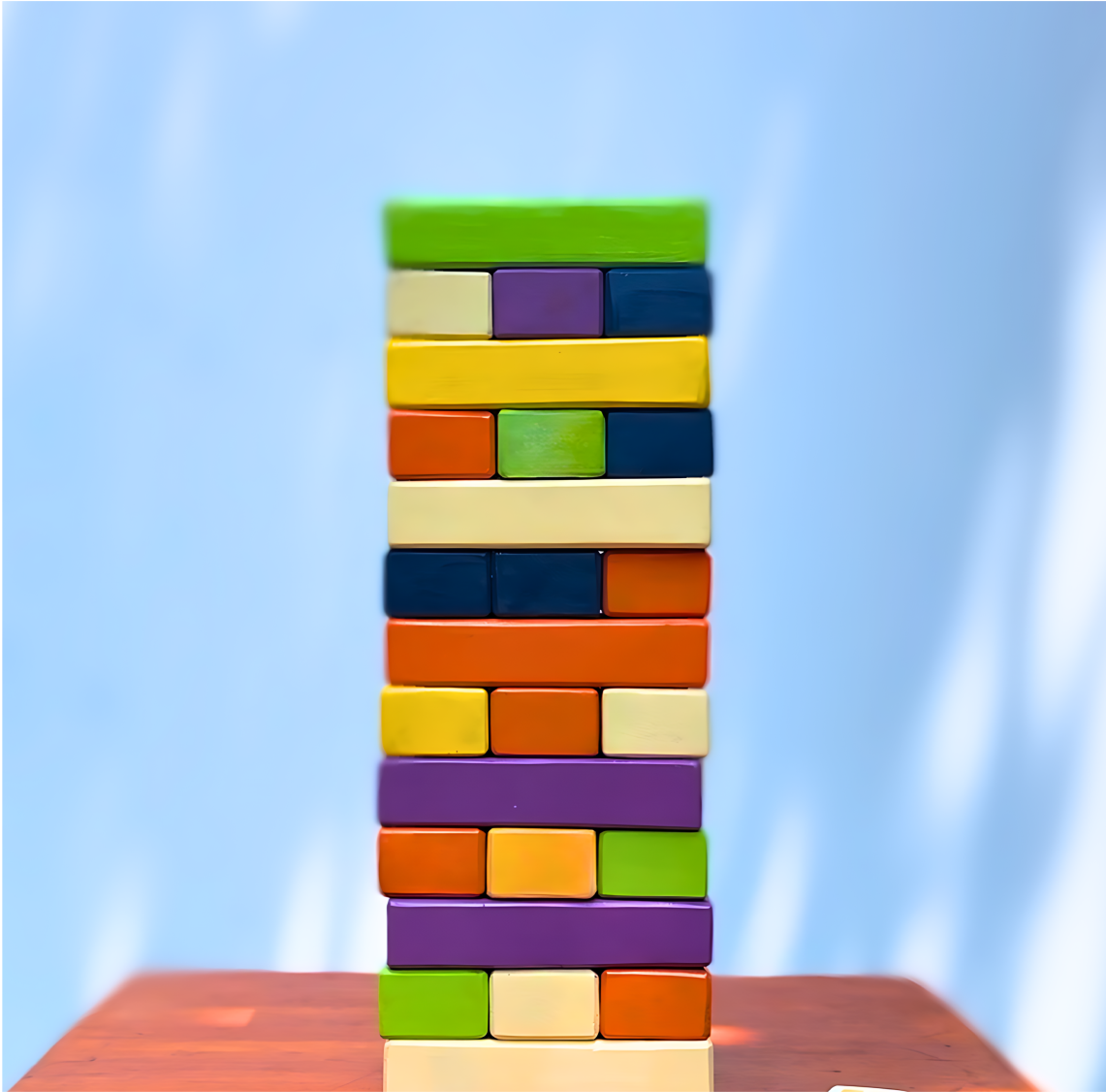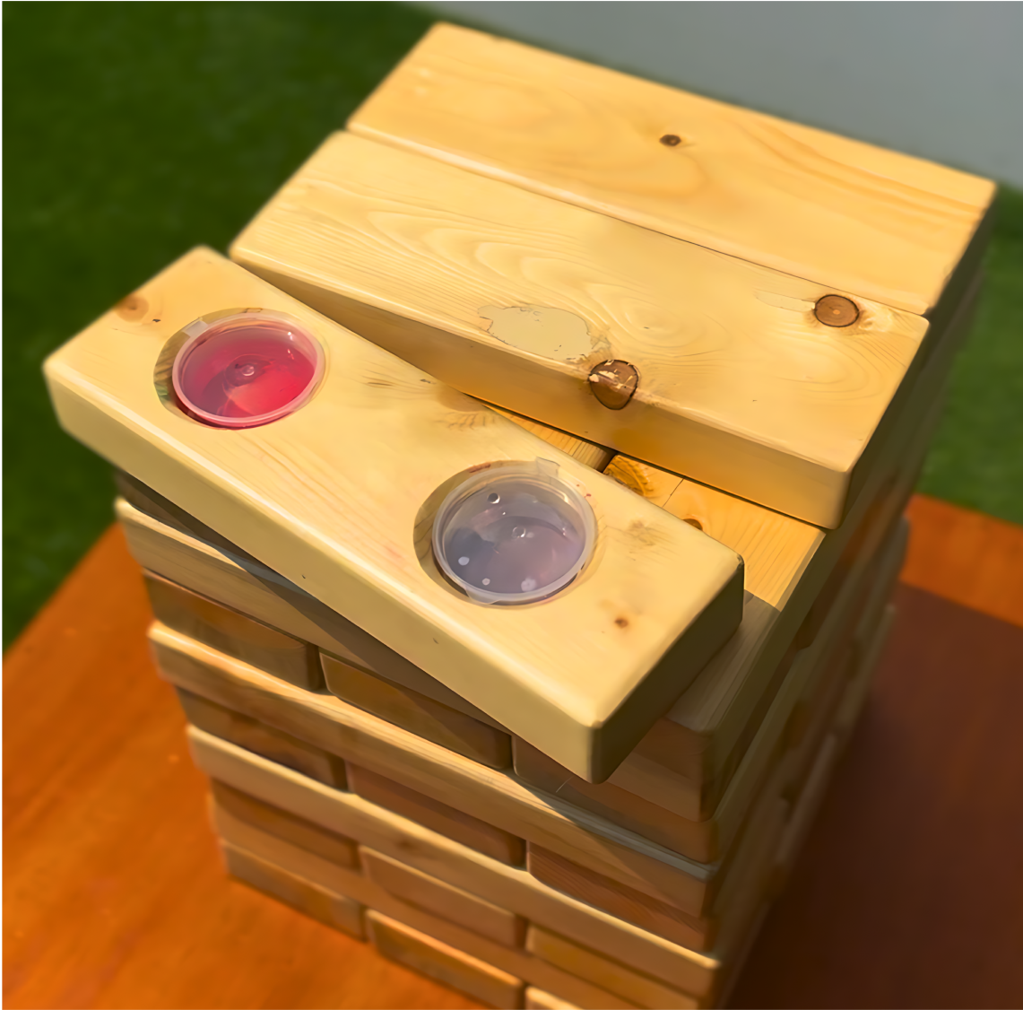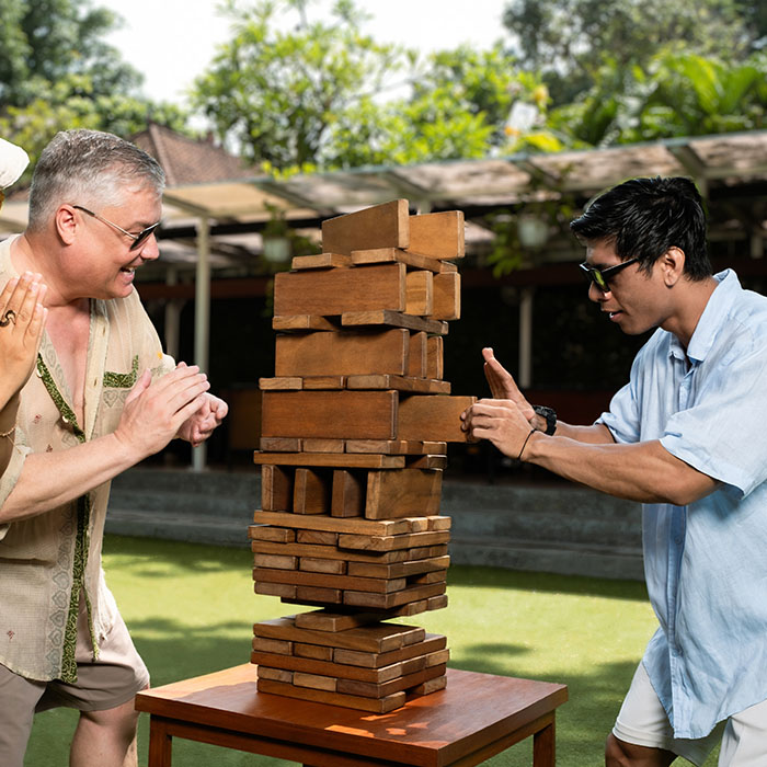 Oversized Jenga stacking game, challenging balance and strategy for groups.