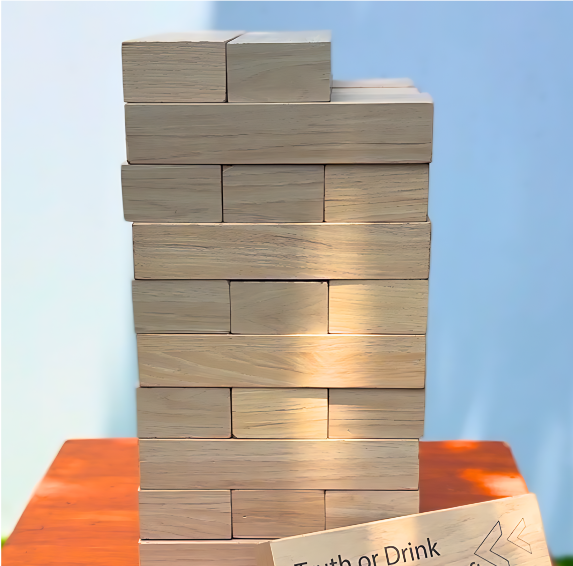 Fun party Jenga with quirky questions, perfect for laughs and bonding!