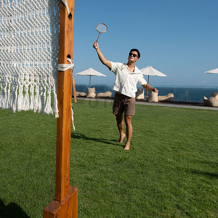 Outdoor badminton with boho-style rackets and shuttlecocks for casual play.