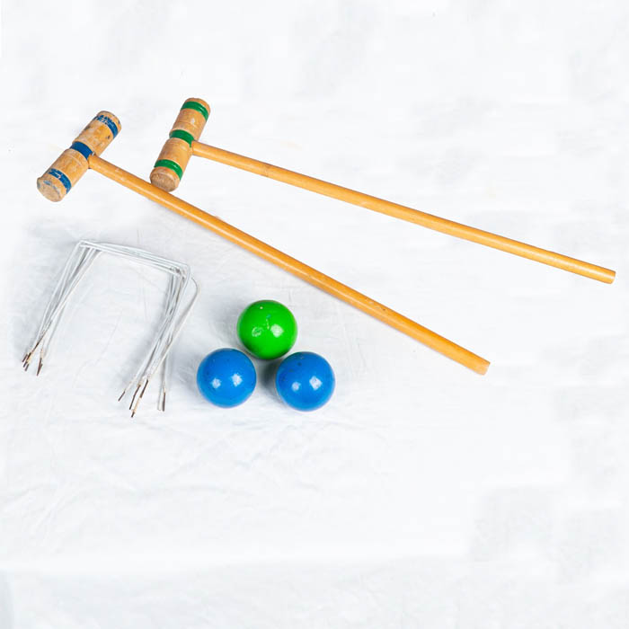 Lawn game hitting balls through wickets with mallets, emphasizing precision.