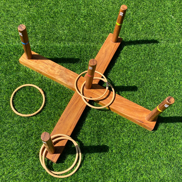 Outdoor game tossing rings onto pegs for accuracy and points.